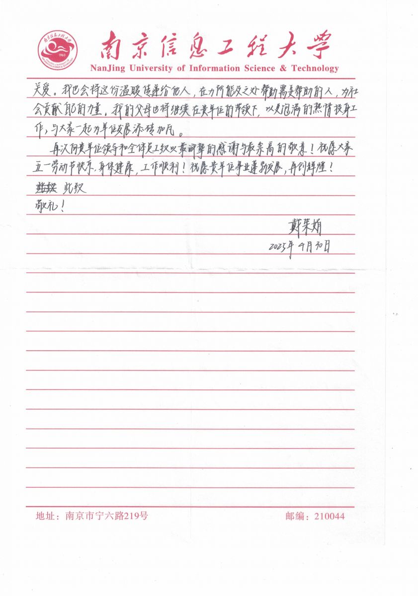 戴荣娟在信中提到,她看到父母在岗位上挥洒汗水、实现价值。而公司也为员工营造的良好工作氛围、给予的成长机会,让父母在工作中不断进步,也让整个家庭充满了积极向上的力量。同时,孩子还感谢公司在生活中给予的关心与帮助,让一家人能够更加安心地生活。